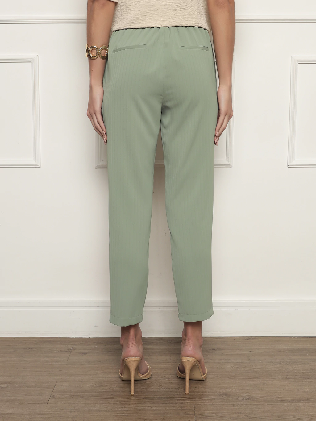 Alfaiataria leve com discreto desenho vertical, garantindo frescor e caimento perfeito.